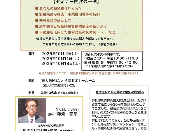 東大阪Mビル 4階セミナールームにおいて 不動産に関するお悩みをお持ちのオーナー様を対象とした 「家主・地主のための相続セミナー・...