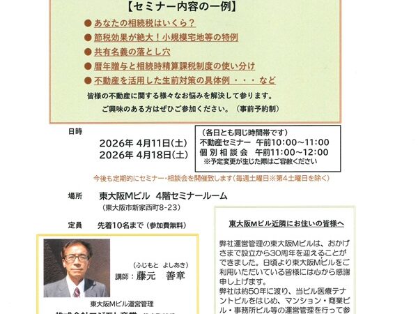 東大阪Mビル 4階セミナールームにおいて 不動産に関するお悩みをお持ちのオーナー様を対象とした 「家主・地主のための相続セミナー・...